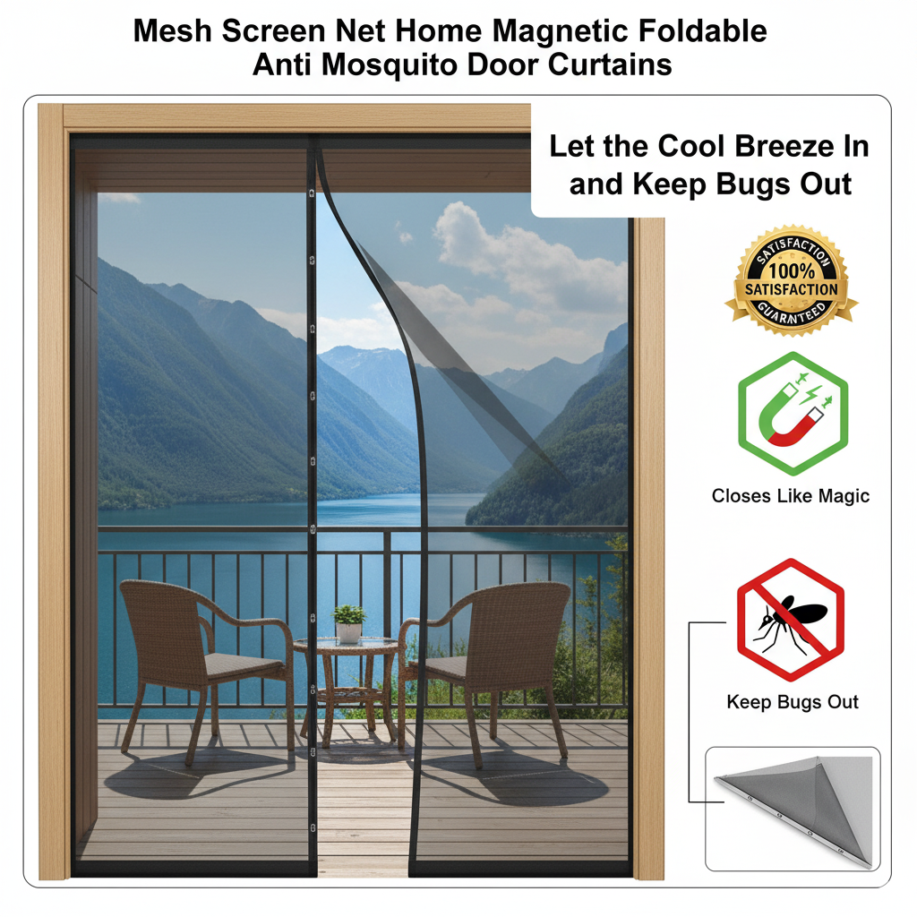 Keep your home fresh and insect-free with this magnetic foldable mesh screen door. Easy to install, durable, and hands-free – perfect for a comfortable, mosquito-free living space.